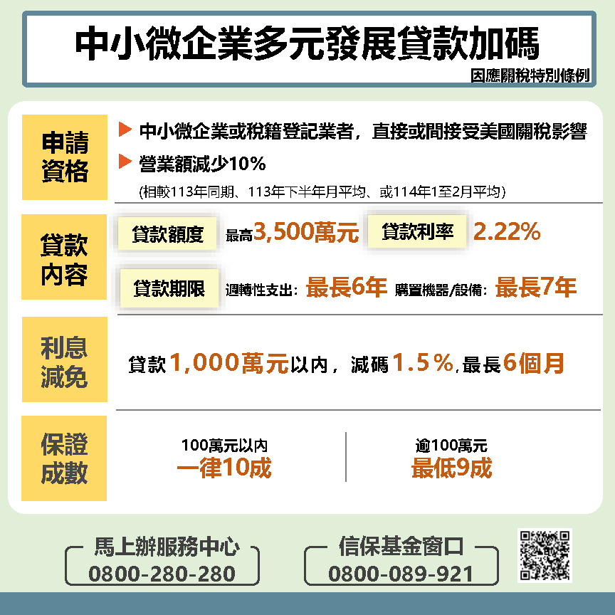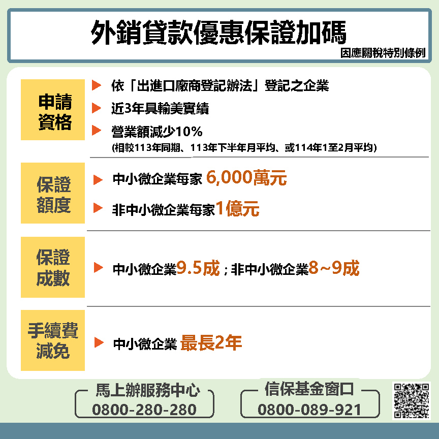 為協助企業發展,減緩美國加徵關稅對其出口所致之影響,訂定本基金「外銷貸款優惠保證加碼信用保證要點」,詳如附件,請查照