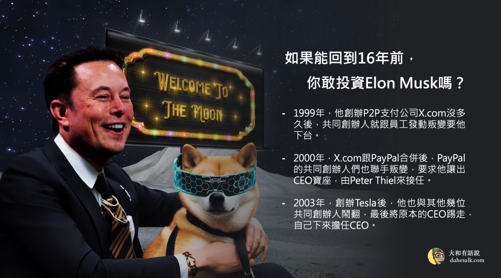 - Elon Musk在1999年創辦P2P支付公司X.com沒多久,共同創辦人就跟員工發動叛變要求他下台。