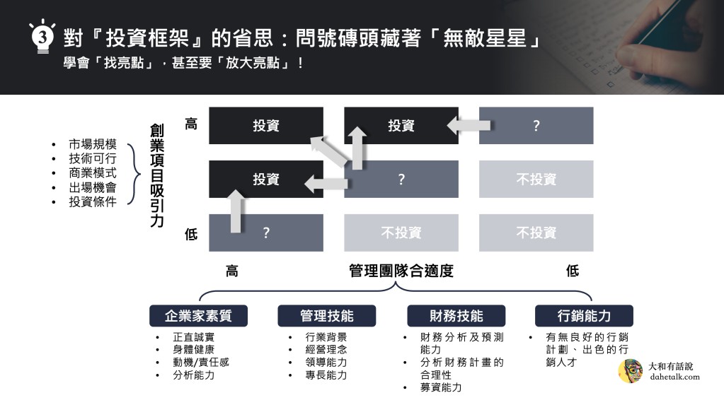 我的第三個省思是關於「亮點」。創投常常在說兩件事,這間公司的upside能多大,downside又可以多糟糕。我曾在「估值就是講故事」的書中,看到一張投資判別的矩陣圖。這個矩陣圖呈現出投資人在看一家新創時所在意的兩大維度,也就是是「管理團隊的合適度」與「創業項目的吸引力」。