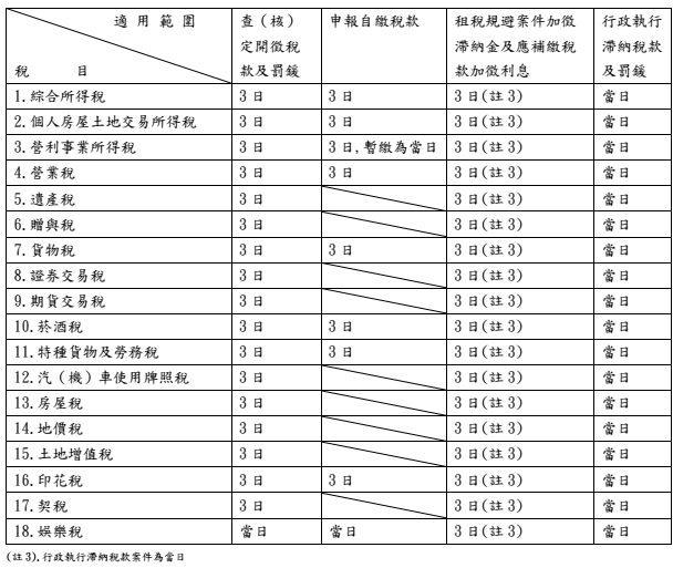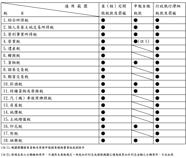概分為四大類,包括查(核)定開徵稅款及罰鍰、申報自繳稅款、租稅規避案件加徵滯納金及應補繳稅款加徵利息(含行政執行滯納稅款案件)、行政執行滯納稅款及罰鍰,其中租稅規避案件加徵滯納金及應補繳稅款加徵利息(含行政執行滯納稅款案件)部分並未區分稅目。