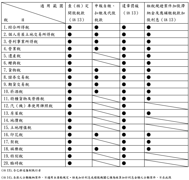 概分為五大類,包括查(核)定開徵稅款(含已移送強制執行者)、申報自繳、扣繳及代徵稅款、違章罰鍰(含已移送強制執行者)、租稅規避案件加徵滯納金及應補繳稅款加徵利息(均含已移送強制執行者)、違反使用牌照稅法罰鍰保證金,其中違反使用牌照稅法罰鍰保證金為特定稅目。