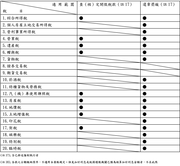 概分為三大類,包括查(核)定開徵稅款(含已移送強制執行者)、綜合所得稅結算申報自繳稅款、違章罰鍰(含已移送強制執行者),其中綜合所得稅結算申報自繳稅款為特定稅目。